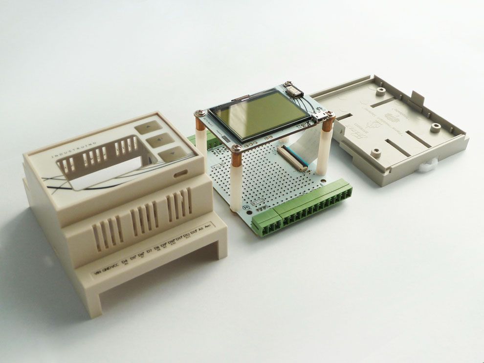 Industruino is an Arduino compatible board housed in a DIN-rail mountable casing.