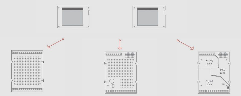 By default all I/O pins are routed to the detachable screw connectors on the bottom board. These connections can be re-routed, for use inside on the proto-board, by removing the 0Ω resistors.