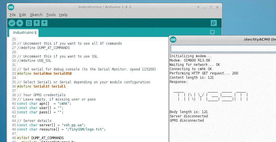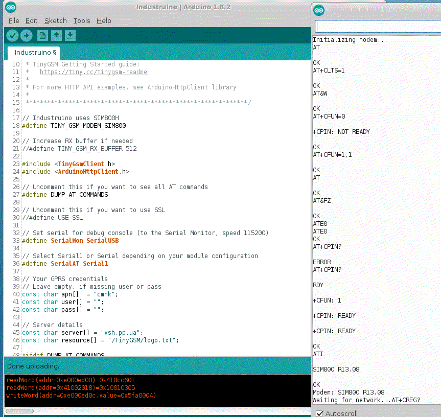 If the sketch gets stuck at any point, it might be useful to see the underlying AT commands and replies that are sent over the Serial1 port. You can enable this by uncommenting the DUMP_AT_COMMANDS line (line 27). Then the Serial Monitor looks like this.