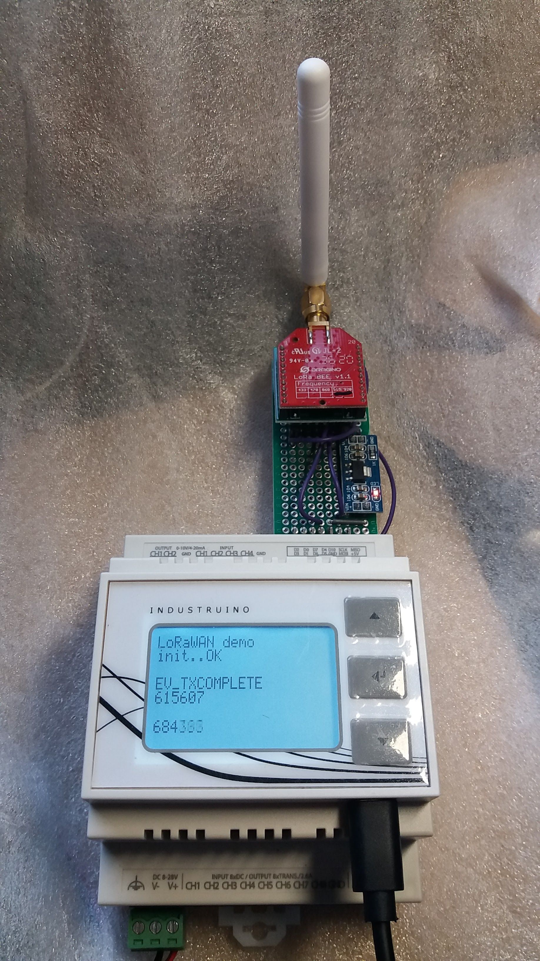 We use a Dragino LoRa BEE radio module, which is built around the common SX1276 transceiver, with SPI communication. We will use the expansion port of the Industruino (IND.I/O or PROTO) which has all necessary pins available.