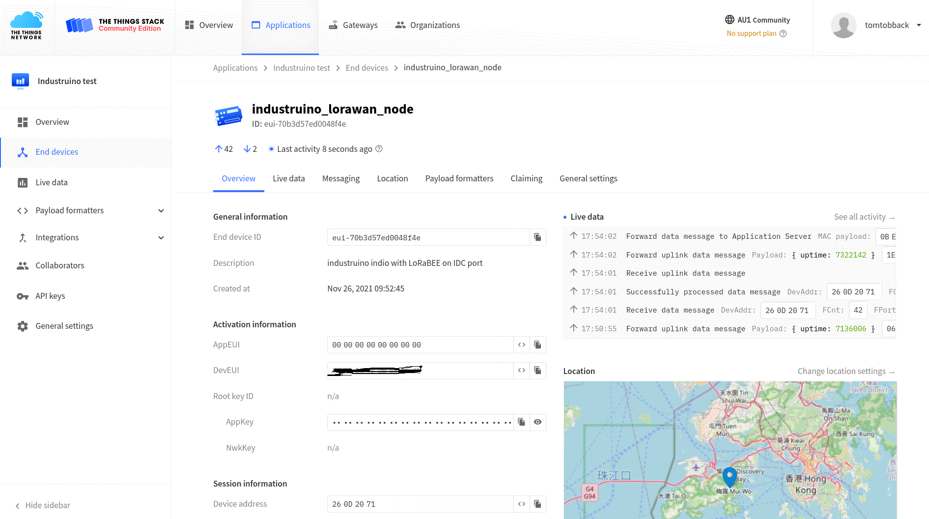 You will need to create an account for the console, to be able to create an application and a device, our LoRaWAN end node (Industruino). Just follow the TTN documentation. Choose OTAA, class A, and generate a DevEUI. AppEUI can be all zeros. Generate AppKey and register the device.