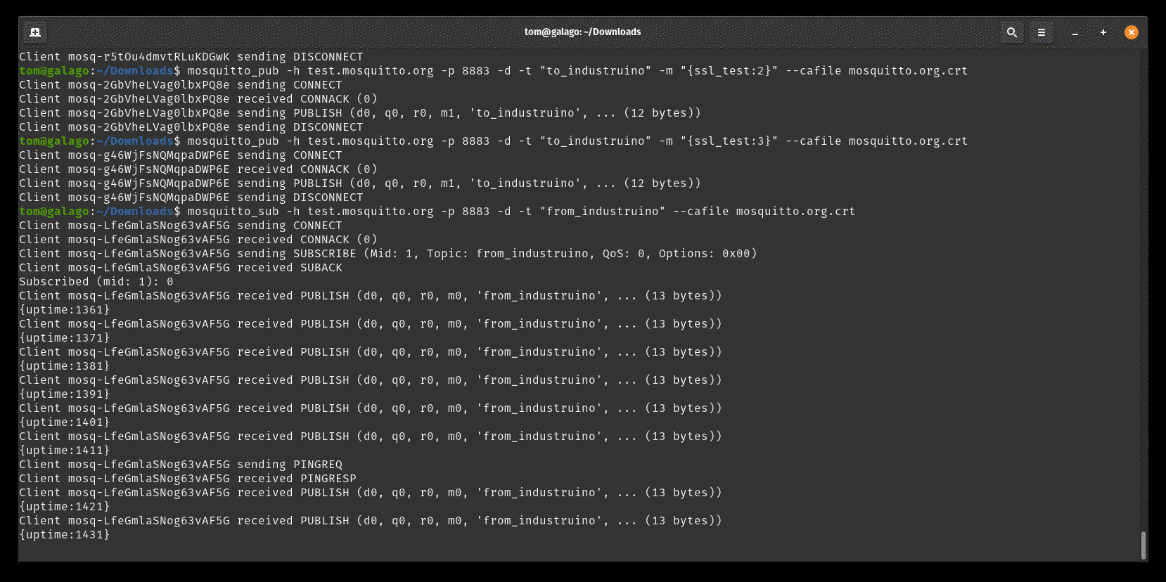 $ mosquitto_sub -h test.mosquitto.org -p 8883 -d -t "from_industruino" --cafile mosquitto.org.crt