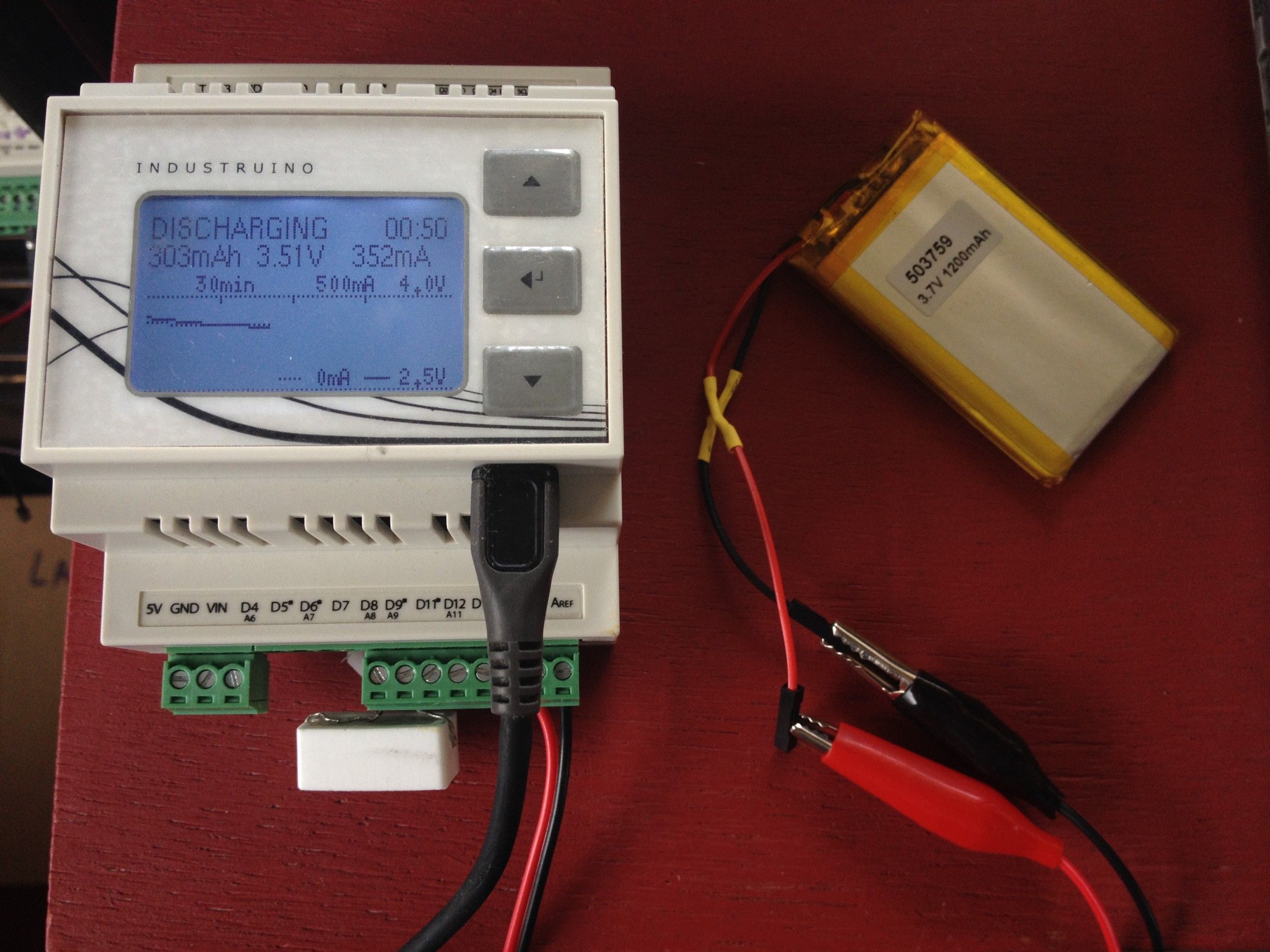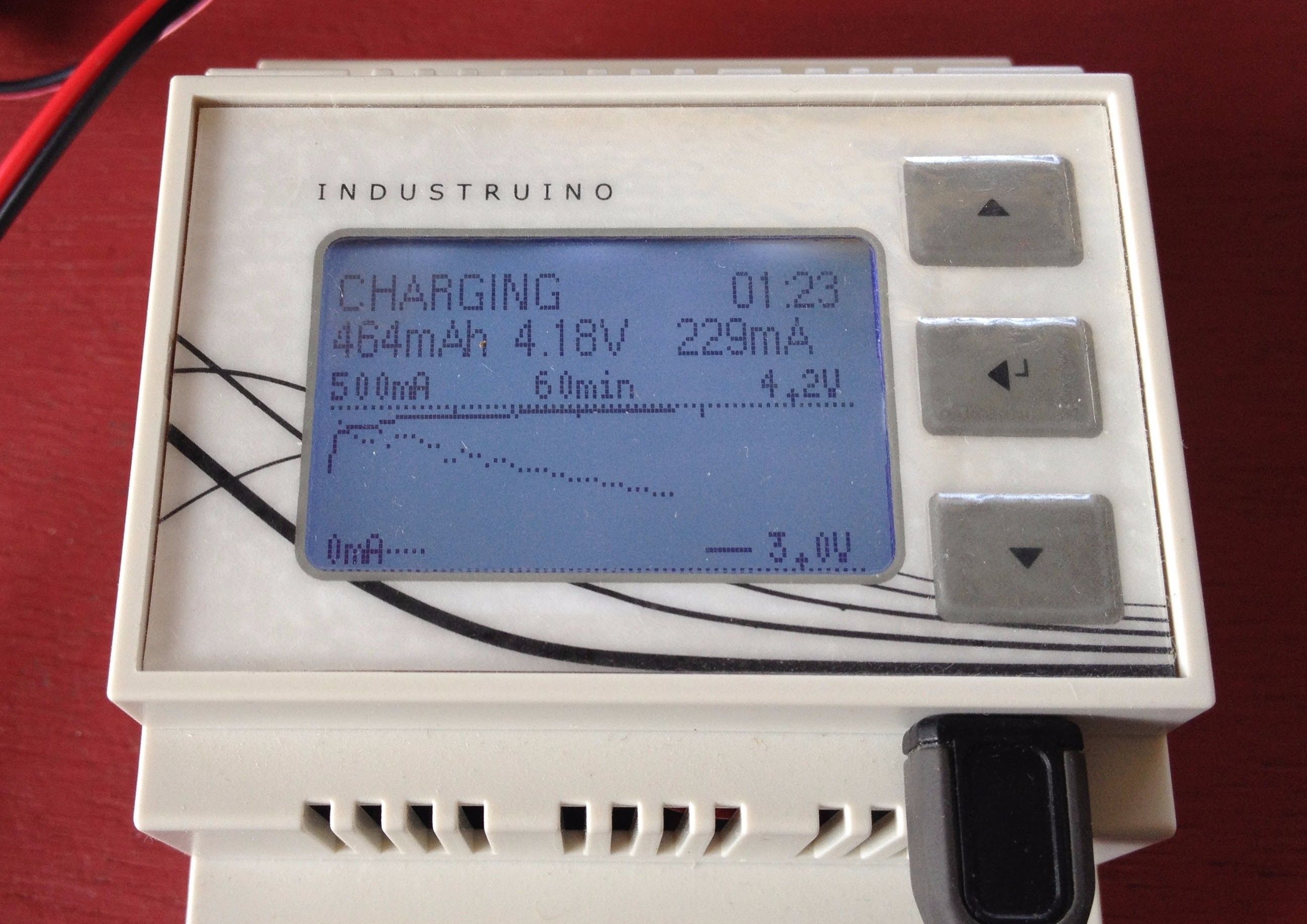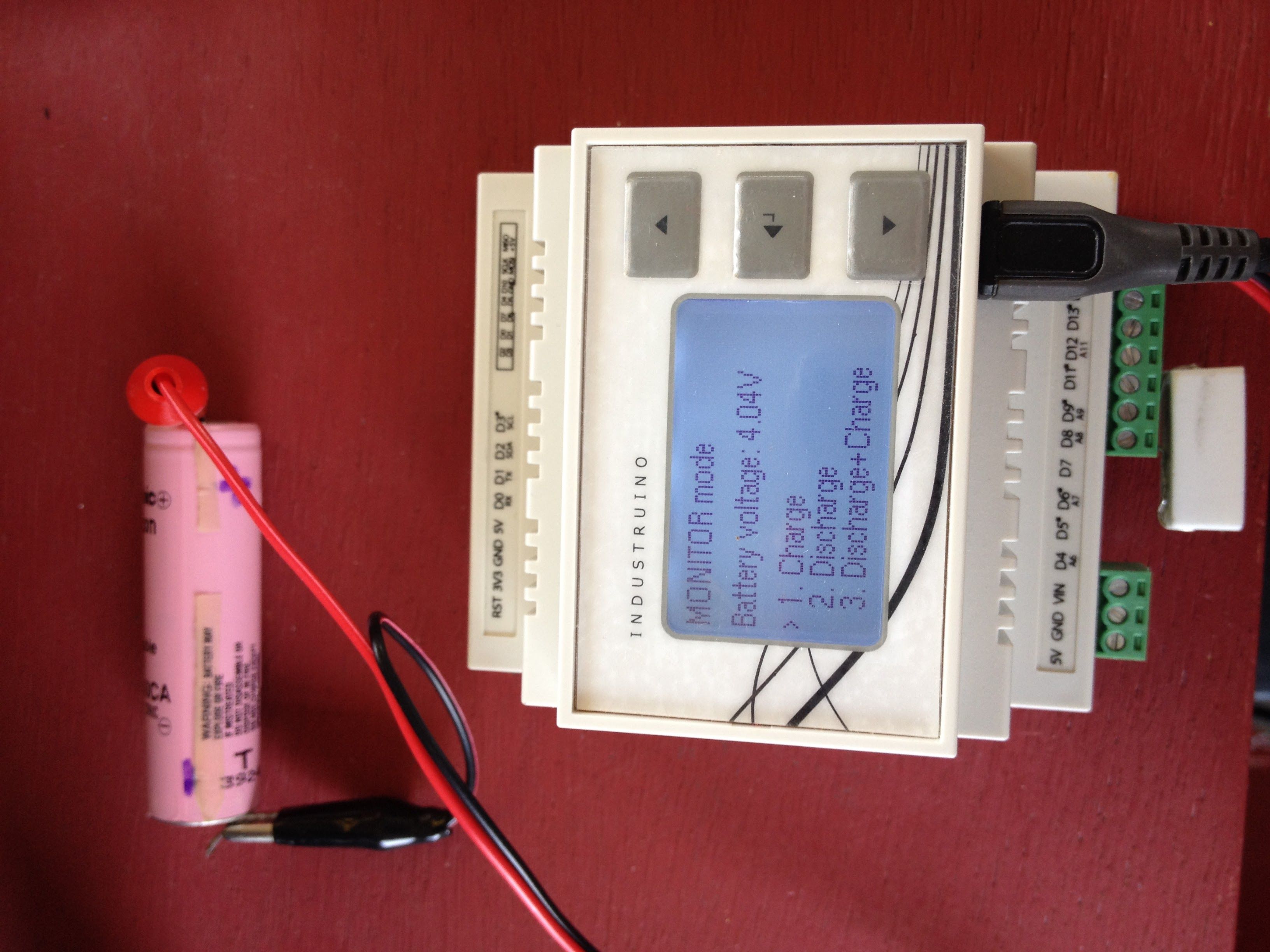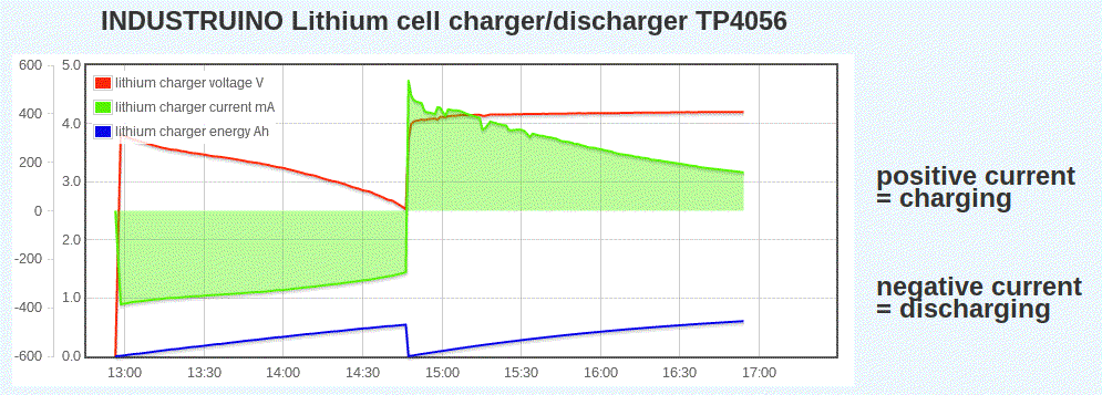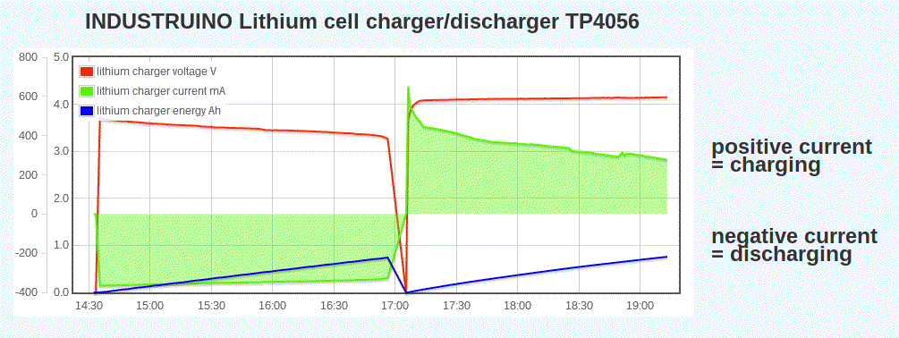 This project uses an Industruino PROTO to build a Lithium charger and discharger, with graphs on the LCD, and data logging over WiFi. It uses a TP4056 charger PCB, an INA219 voltage/current monitor, and an ESP8266 WiFi module.