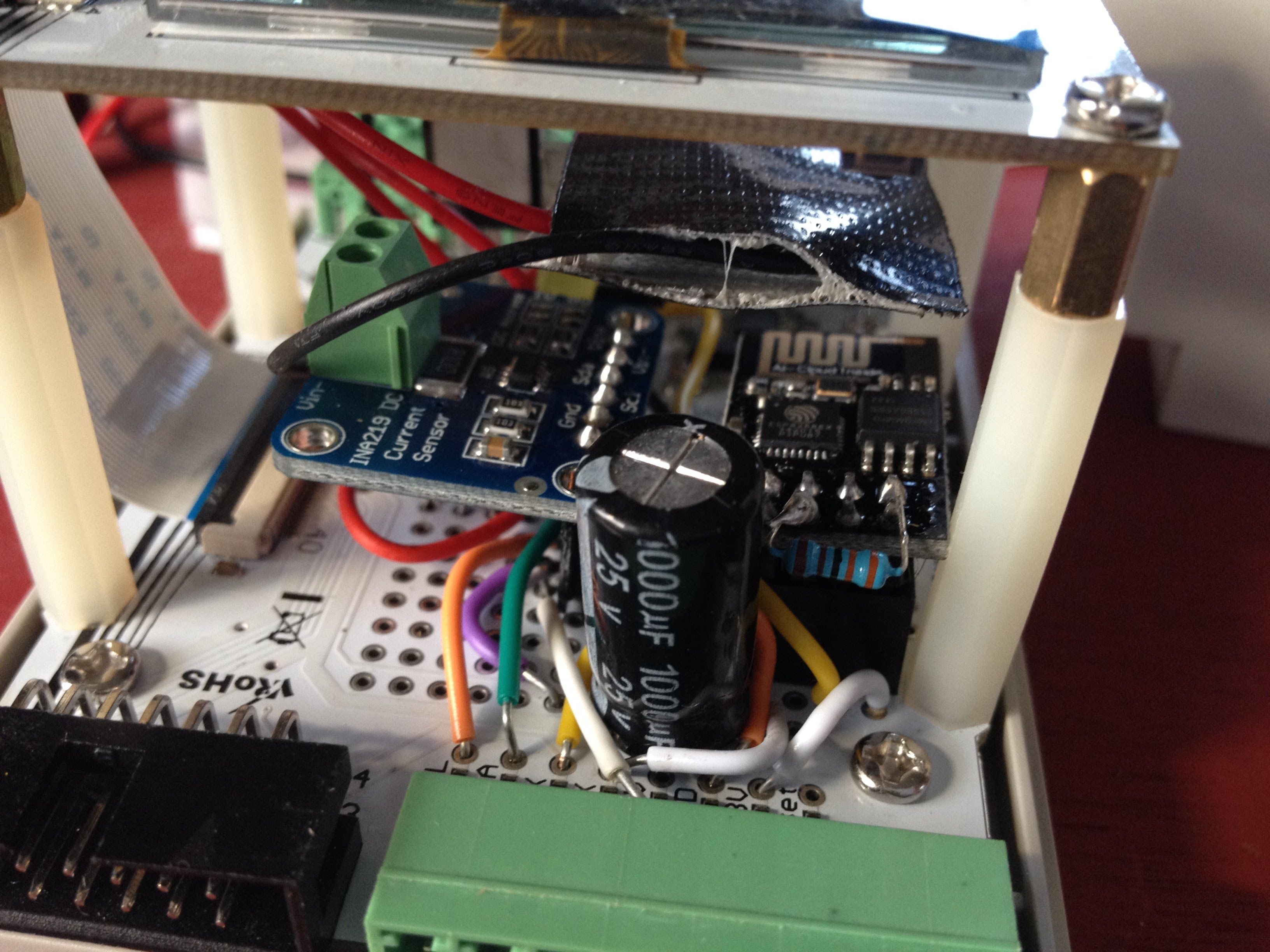 The picture above left shows the INA219 on the left and the ESP8266 on the right, with its a large decoupling capacitor.
