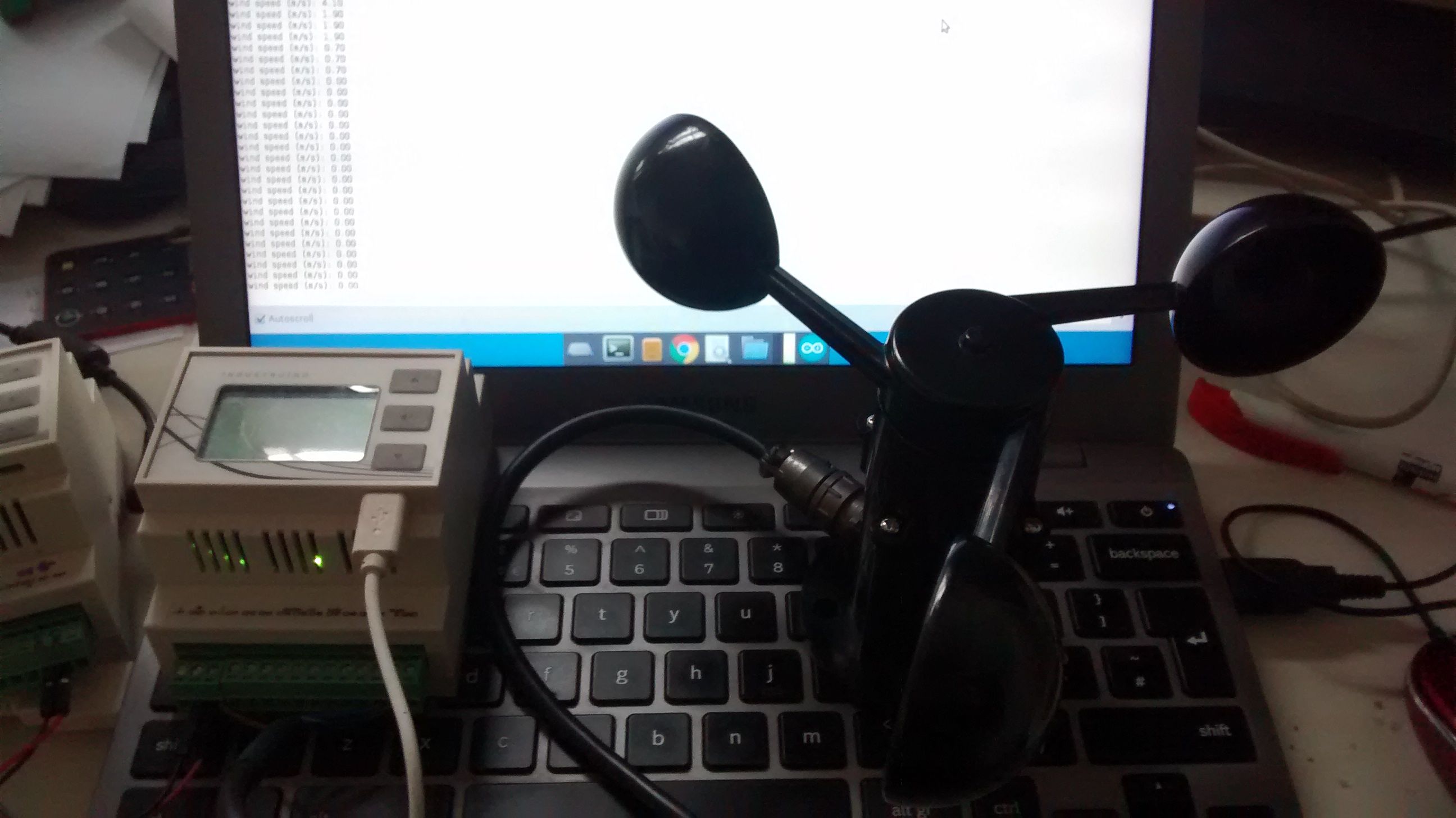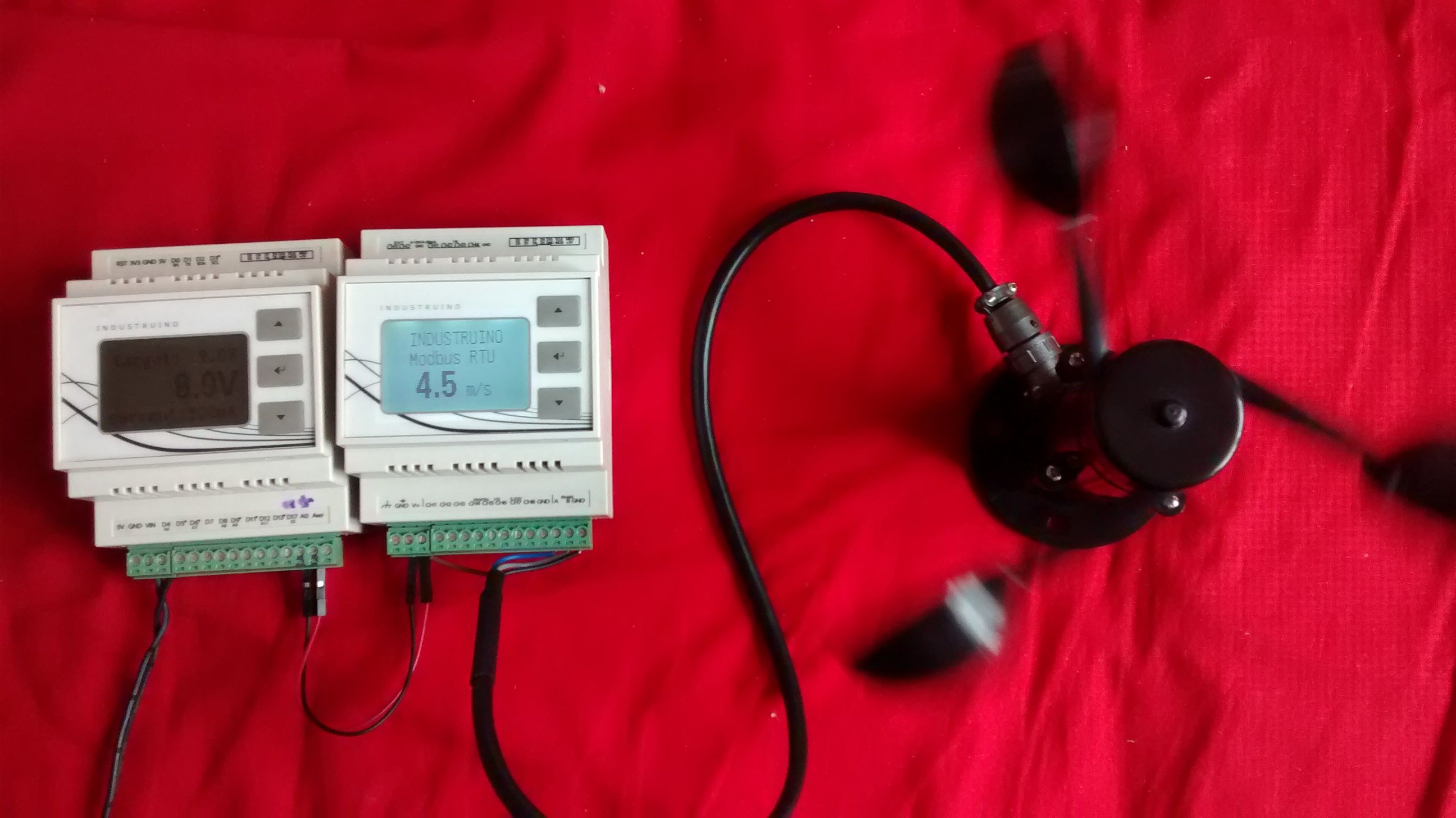 The wind speed sensor (anemometer) that i have, uses the Modbus protocol over an RS485 connection, aka Modbus RTU. The sensor is the Modbus Slave and the Industruino is the Modbus Master.