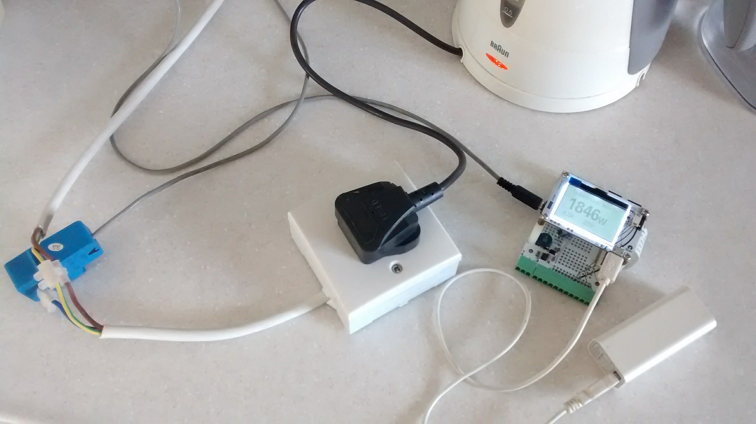 The CT, as shown in the picture above, is clamped around 1 wire of the mains (live or neutral, not both!), and it has 2000 windings and a max current of 50mA so it can read up to 100A. More info here.