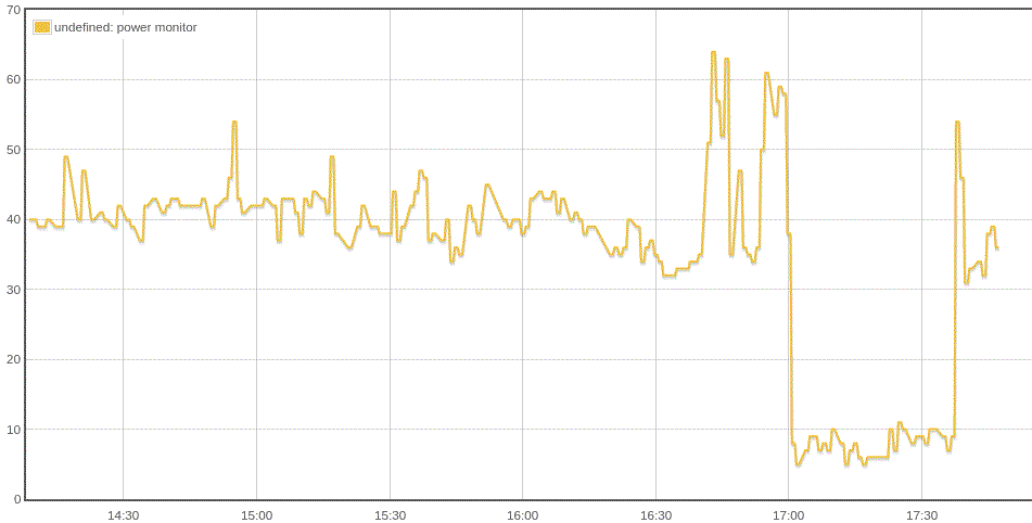 This is a graph on emoncms.org with 3 hours of data for my laptop charger, which consumes around 40W when the laptop screen is on, and less than 10W when off.