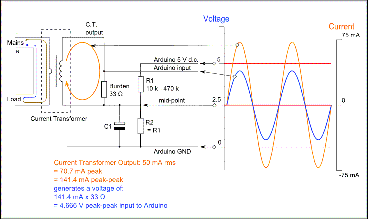 We want to capture the small alternating current that is proportional (1:2000) to the AC that goes through the main wire. We convert this current into a voltage by putting through a burden resistor, as in the picture on the right.