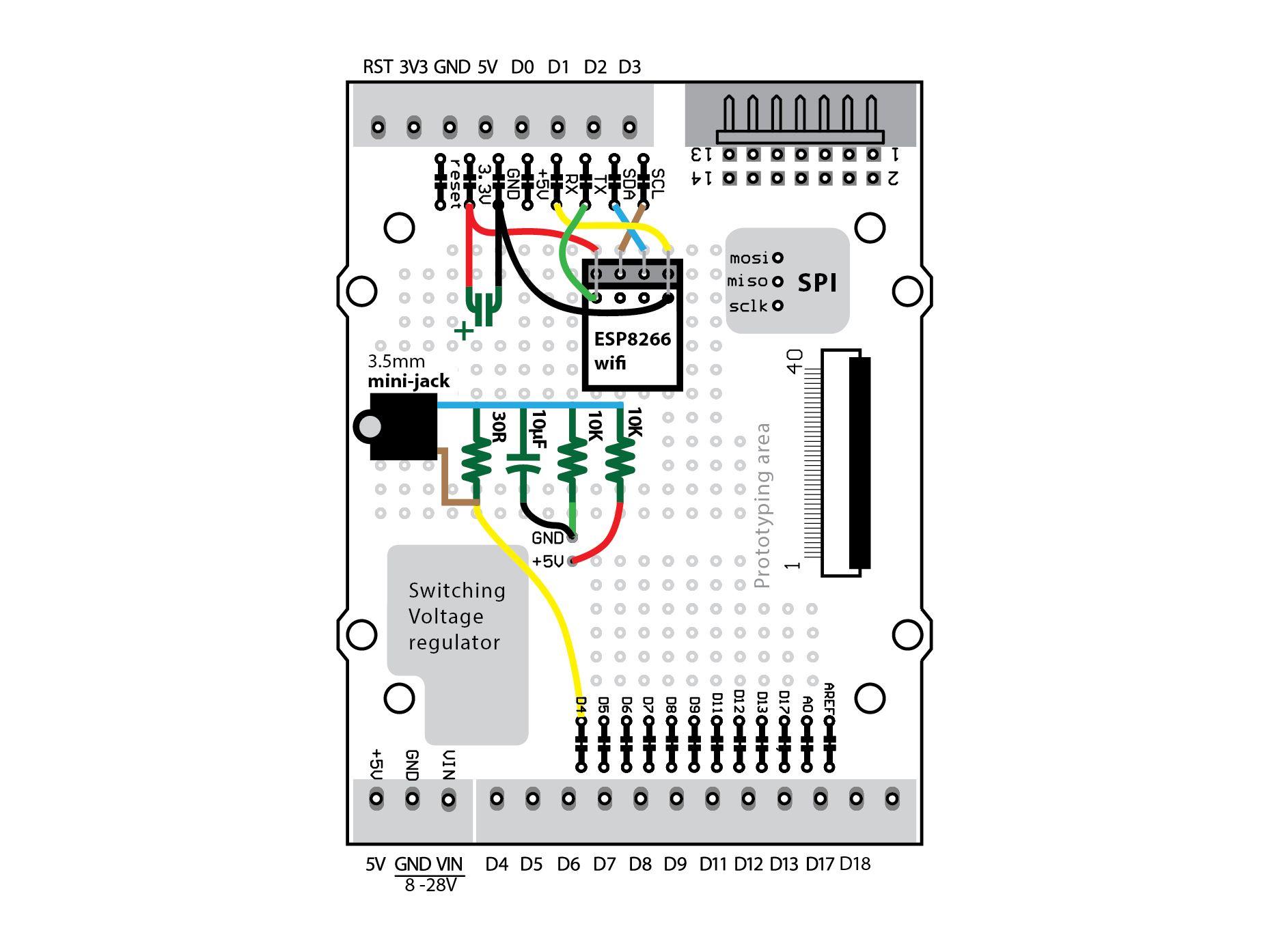 The diagram on the right shows you how to wire the sensor conditioning circuit and ESP8266 module onto the prototyping area of the Industruino.