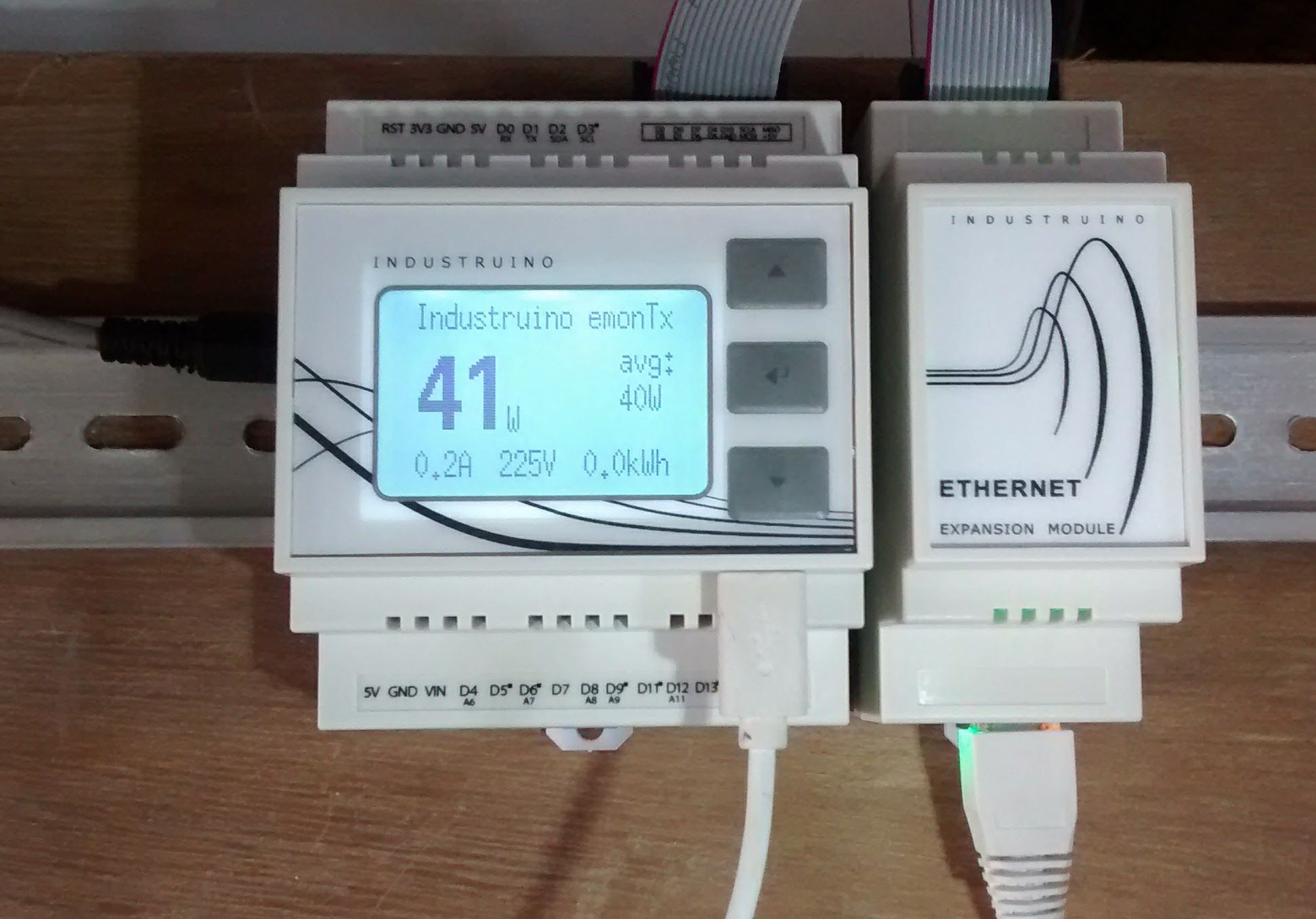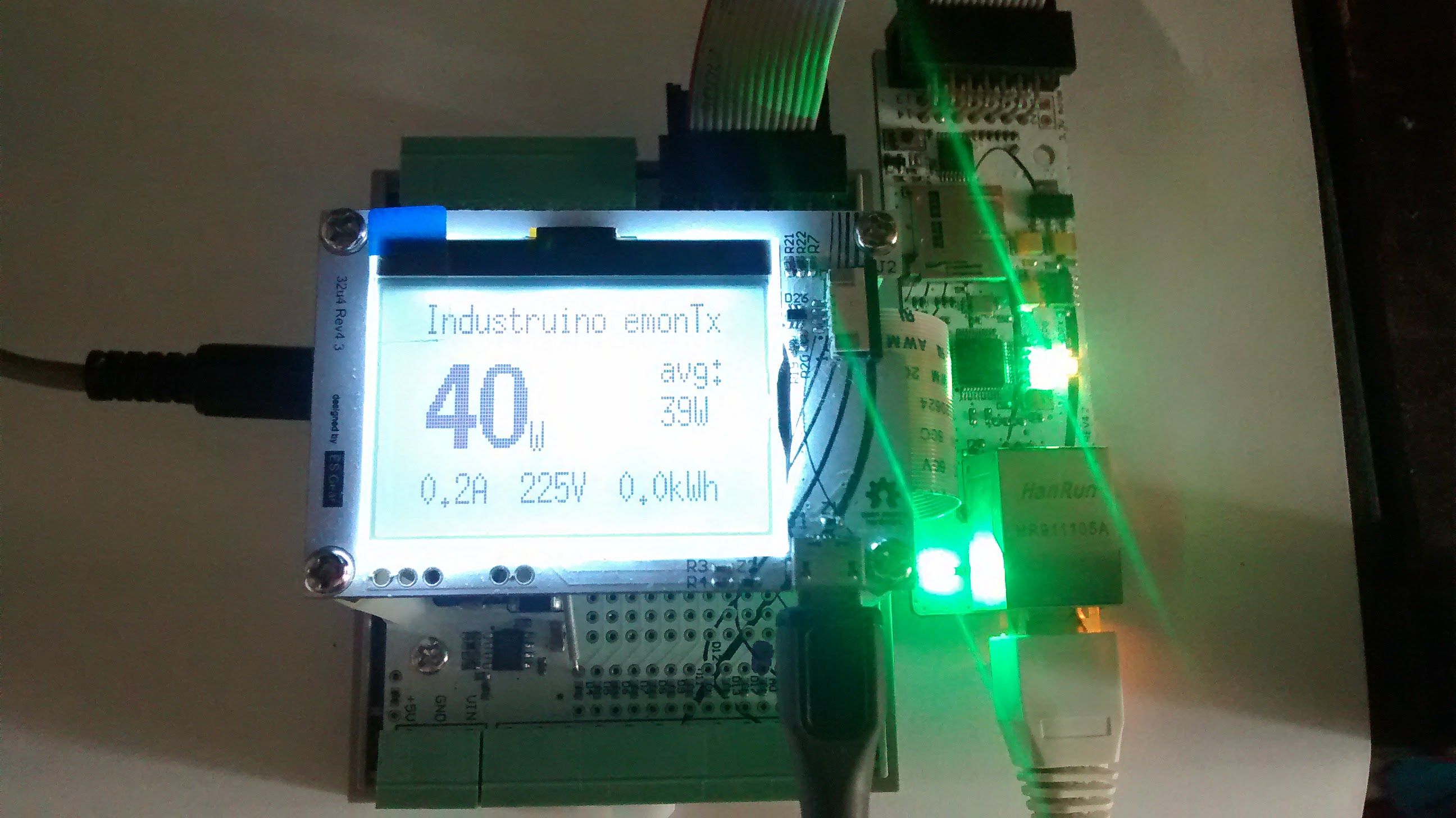 I have also added a counter in the code to keep track of kiloWatt-hours (kWh) since startup of the Industruino, and average power consumption. The timing is not exact; as far as i can tell it's accurate to about 3%.