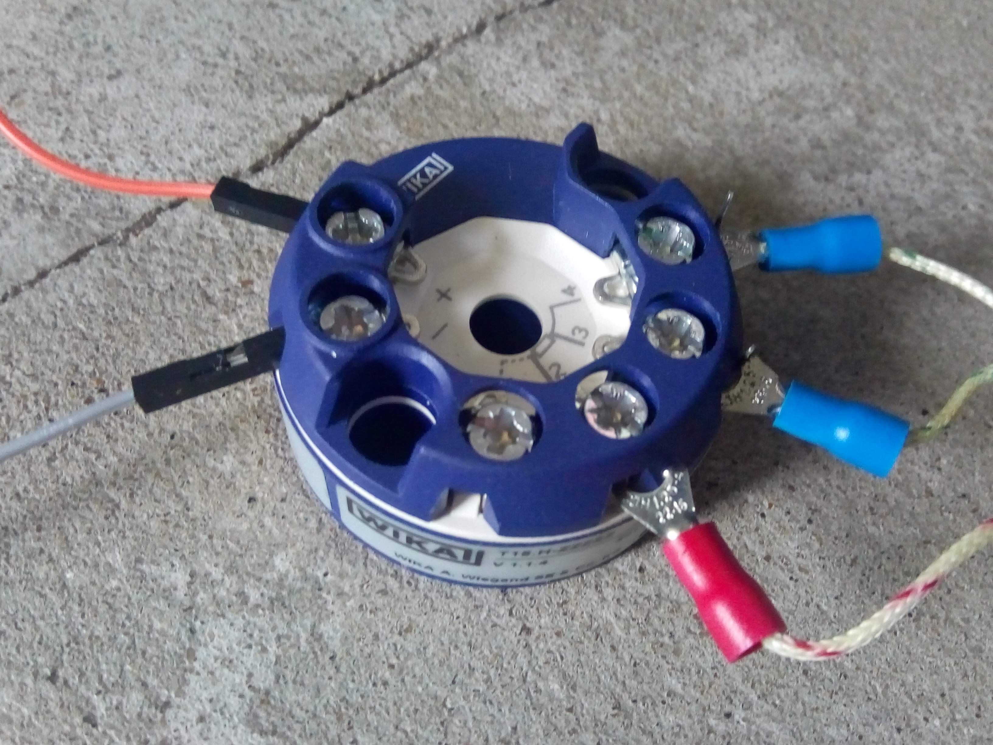 A common way to use the PT100 is to add a transmiter, that converts the resistance into a 4-20mA signal. Such current loop is stable over long cable lengths. In this example we use a WIKA T15.H transmitter which can handle 2,3,4 wire PT100 and PT1000 sensors, and has programmable ranges and error handling (if you get the programmer).