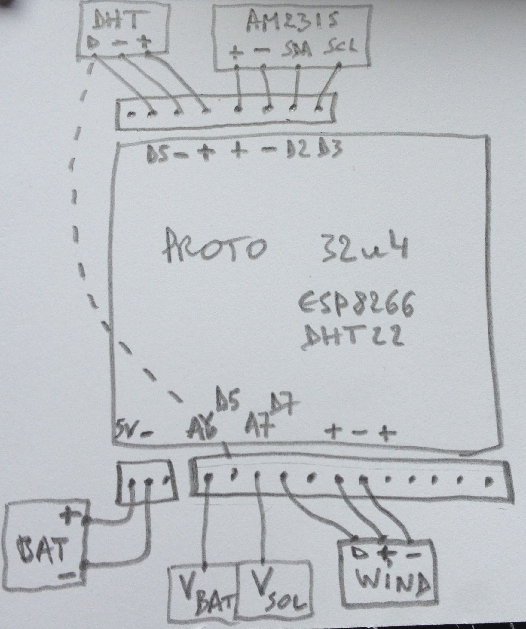 The sketch is quite simple, with standard libraries for the DHT22 and AM2315 sensors. The only challenge is the use of an interrupt to count the pulses from the wind speed sensor, on D7.