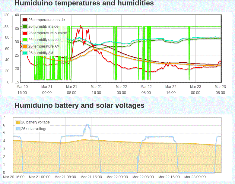 The below graph shows the LiPo battery voltage and the solar voltage, taken from the charger board.